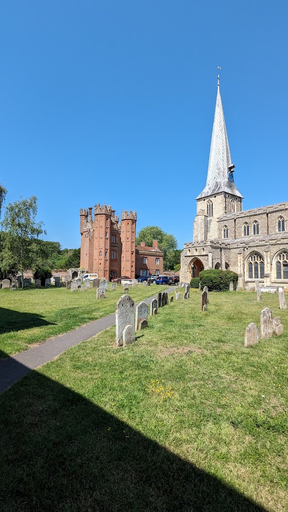 Of particular note is the Deanery Tower. This spectacular building of 1495 overlooks the churchyard close to the Guildhall-Town Hall complex (see below) which is a striking timber-framed vernacular building, but this gatehouse is a highly elaborate piece of architecture built by William Pykenham, who held the senior ecclesiastical offices of Dean and Rector of Hadliegh and Archdeacon of Suffolk in the late-15th century. It was to be the entrance to a palatial residence which was never completed because Pakenham died shortly after the tower was built.